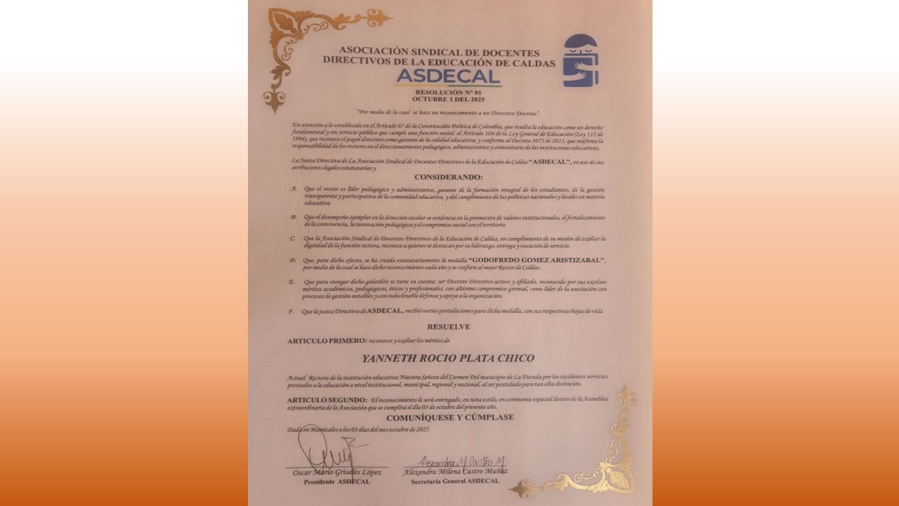 de la Asociación Sindical de Docentes y Directivos de la Educación de Caldas un reconocimiento como la Mejor rectora del